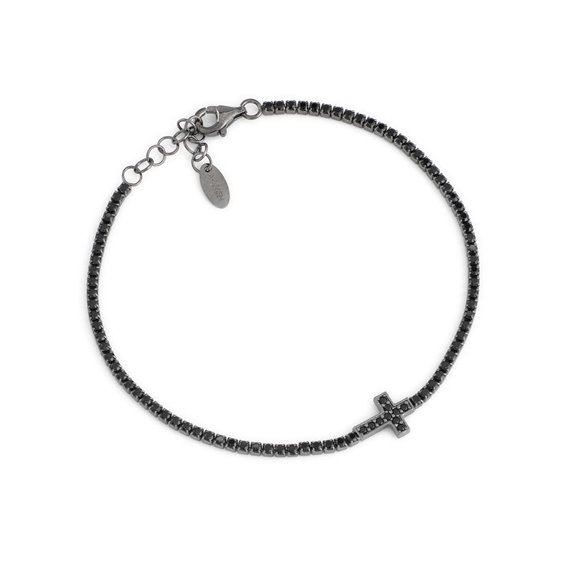 Bracciale tennis in Argento 925/°°° con finitura brunita e zirconi neri con croce al centro; lunghezza personalizzabile da 16 a 19 cm