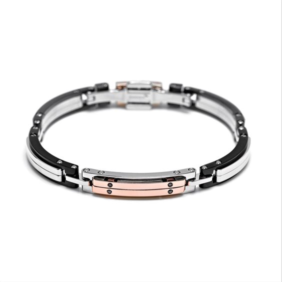 Bracciale in acciaio lucido e PVD nero, piastra centrale in oro rosa 7501000 con diamanti neri Ct 0,04