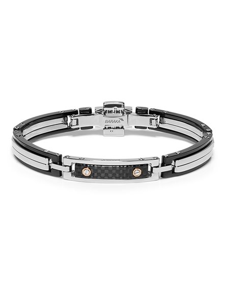 Barakà, storico marchio di gioielleria nato negli anni Sessanta, è oggi un brand affermato di gioielli di lusso per l’uomo ad alto contenuto tecnico e ingegneristico. L’universo dei valori di Barakà si esprime in gioielli interamente realizzati in Italia che uniscono lusso e innovazione, eleganza e cura del dettaglio, e in collezioni tematiche che raccontano storie di conquiste, di avventure e di icone del design italiano reinterpretate nell’alta gioielleria. Lo stile dell’uomo Barakà raccoglie tutti questi valori declinati nei tre mondi che lo vedono protagonista: business, tempo libero e svago. Lo stile dell’uomo Barakà raccoglie tutti questi valori declinati nei tre mondi che lo vedono protagonista: business, tempo libero e svago. Perché l’uomo Barakà si divide tra importanti incontri business, serate di gala e appuntamenti esclusivi e ama dedicare il suo tempo libero a hobby e sport raffinati dal sapore di altri tempi, come la vela o le macchine d’epoca. Il filo conduttore di questi momenti di vita, rimane il lusso distintivo e il design riconoscibile dei gioielli Barakà: avanguardia produttiva e artigianalità orafa 100% Made in Italy. Bracciale in acciaio inossidabile e acciaio con trattamento PVD nero con inserto in fibra di carbonio e dettagli in in oro rosa 750‰