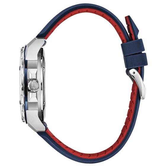 Orologio solo tempo da uomo di Bulova della collezione marine star. Orologio realizzato con cassa in acciaio di 44 mm. Il cinturino è in caucciu' blu con chiusura ardiglione. Gli indici sono numeri romani. Il movimento è automatico. La resistenza all'acqua è di 20 atm. Funzioni: solo tempo automatico. La referenza è 98A225.