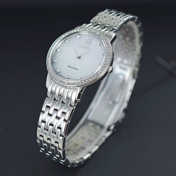 orologio solo tempo donna della Collezione Lady Collection. movimento Eco-Drive (a carica Luce) con riserva di carica di 6 mesi con funzione ore-minuti.Vetro Zaffiro. Quadrante bianco con cristalli, lancette lucide. Cassa in acciaio Lucido Ø 30mm impreziosita da cristalli incastonati nella lunetta, uno straordinario effetto di luce brillante ed eleganza. Bracciale regolabile in acciaio lucido con maglia tipo panther e chiusura déployante con pulsanti. Impermeabile 5 bar (50 metri).