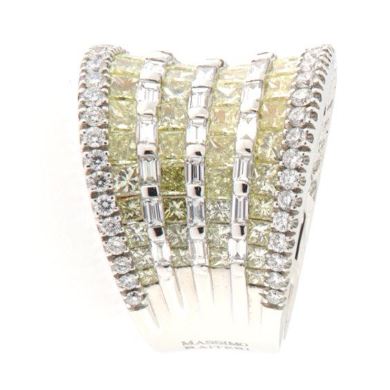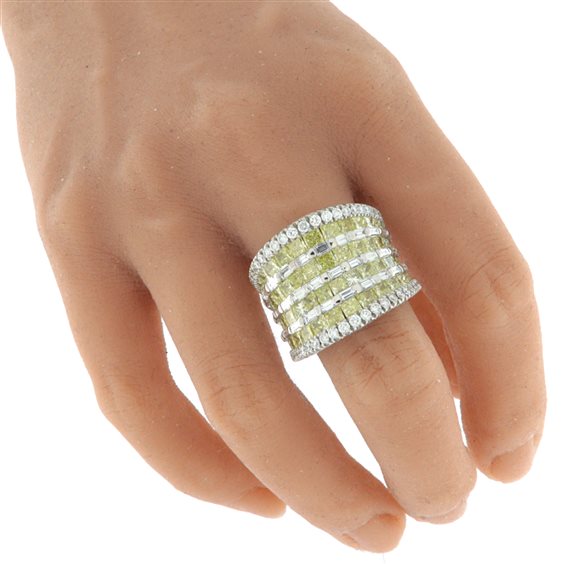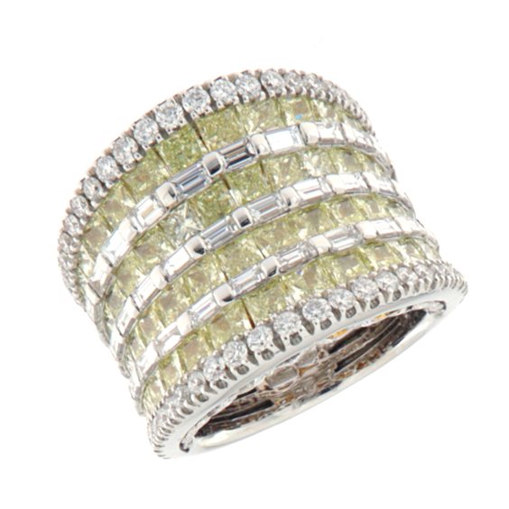 ANELLO A FASCIA IN ORO BIANCO CON INCASTONATI DIAMANTI FANCY YELLOW TAGLIO PRINCESS E DIAMANTI BIANCHI.