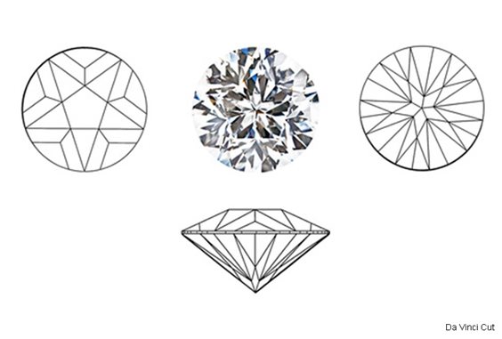 Partendo dalla gemma grezza e tagliandola seguendo la traccia dei disegni dei poligoni di Leonardo, il diamante prende forma ed alla fine del processo, il risultato è a dir poco strabiliante. Si ottiene un taglio unico e perfetto in grado di enfatizzare al massimo le caratteristiche della pietra, che così tagliata presenta 57 sfaccetture. Il Leonardo Da Vinci Cut origina una tavola pentagonale che sovrasta con un effetto caleidoscopico tre stelle visibili ad occhio nudo, cosa che non accade nei tagli classici, per i quali è necessario usare lenti particolari per vedere l’effetto delle luci (come per esempio accade nei diamanti “cuori e frecce”). Basta metterlo a confronto con pietre di uguali caratteristiche ma di taglio tradizionale, per vedere come il diamante Leonardo Da Vinci Cut risulta essere più brillante e luminoso, tanto che nelle scale normalmente utilizzate per verificare le sue caratteristiche, oltrepassa il livello cosiddetto “Ideale”. Ciascuna faccetta esprime la massima lucentezza che unendosi e moltiplicandosi con le altre, rende il Leonardo Da Vinci, un taglio dalla bellezza incredibile. A differenza del taglio classico infatti, questo taglio presenta una tavola a forma di pentagono tanto che all’interno del diamante si formano tre strati di “stelle” visibili ad occhio nudo. DIAMANTE CON CERTIFICAZIONE IGI COLORE E PUREZZA VS1 TAGLIO EX NONE