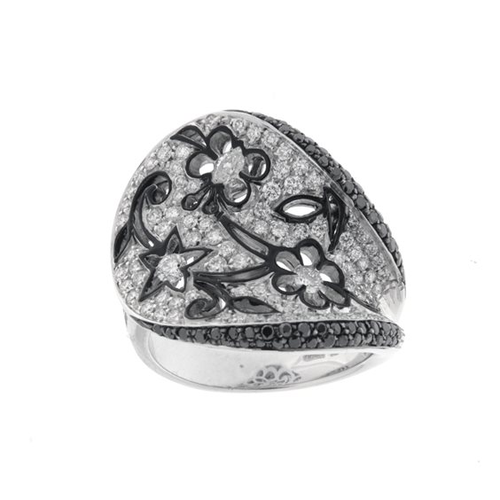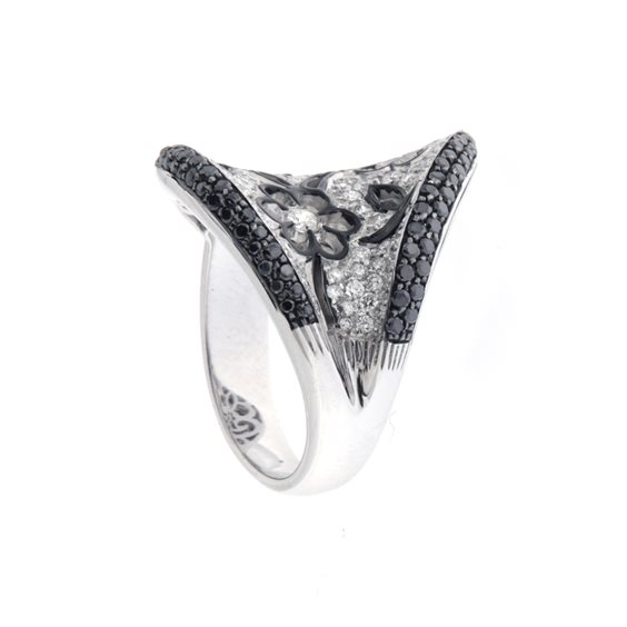 ANELLO IN ORO BIANCO CON DIAMANTI BIANCHI E NERI CON FINITURE SMALTATE. DIAMANTI BIANCHI CT. 0.87 COLORE G PUREZZA VVS DIAMANTI BLACK CT. 0,40
