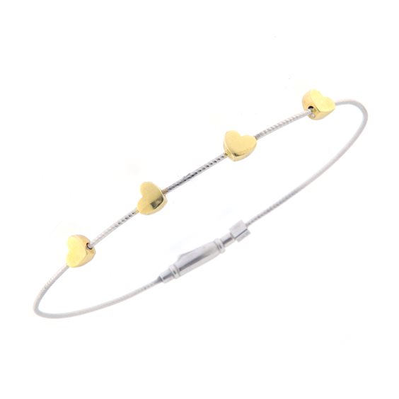 BRACCIALE IN ORO BIANCO E GIALLO, FILO INTRECCIATO IN ORO BIANCO E CUORI LUCIDI IN ORO GIALLO.