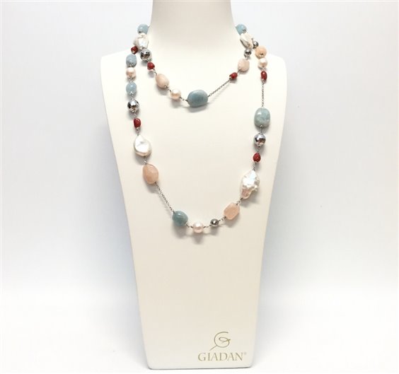 Collana lunga, della collezione Artelier, in argento. Perle barocche bianche di fiume, elementi in corallo rosso e Berillo.