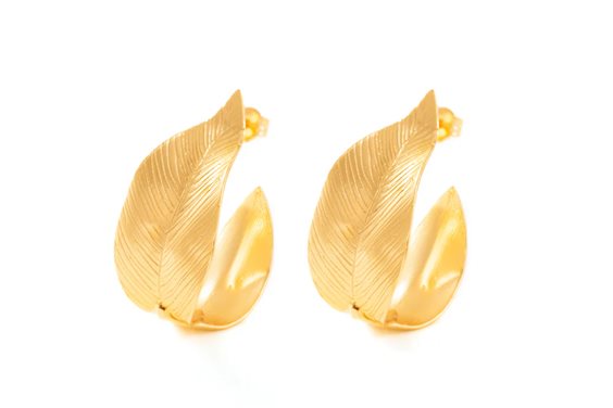 Gli orecchini Leaves Hoop Large sono composti da una foglia che avvolge delicatamente il lobo, creando un cerchio di luce attorno al viso. Il pezzo cattura e riflette la storia di chi lo indossa. I gioielli di Giulia Barela sono in bronzo bagnato in oro 24 carati, realizzati a mano con l'antica tecnica della cera persa.