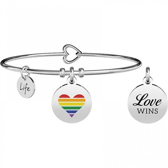 Bracciale Da Donna Di Kidult Della Collezione Love. Bangle In Acciaio Con Ciondolo Con Cuore In Smalto Multicolore. Gioiello Con Smalti Colorati Sul Ciondolo . La Frase Incisa È: Su Ogni Pregiudizio, Qualsiasi Ostacolo, Qualunque Ragione. L'Amore Vince Sempre.. Materiale: Acciaio 316L, Smalto. Gioiello Con Chiusura Tonda. Misura Unica, Diametro 6 Cm.