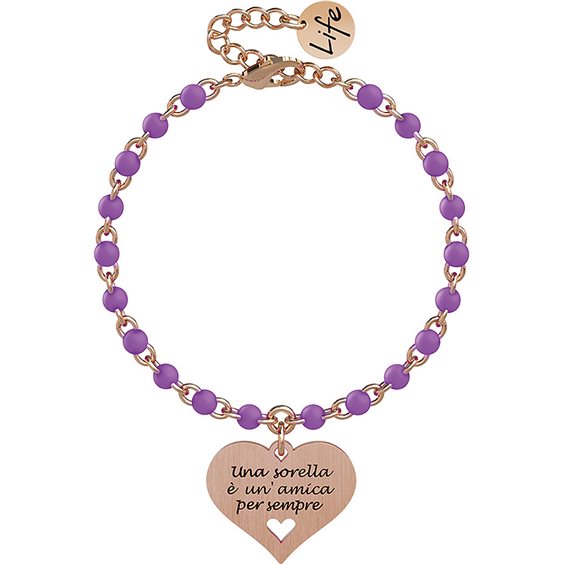 Bracciale Da Donna Di Kidult Della Collezione Family. Bracciale In Acciaio Color Oro Rosa Con Ciondolo A Cuore E Catena Rolò Con Inserimenti In Smalto Viola. Gioiello Con Incisione Smaltata Sul Ciondolo E Inserimenti In Smalto Sulla Catena . La Frase Incisa È: Una Sorella È Un'Amica Per Sempre. Materiale: Acciaio 316L Con Pvd Oro Rosa, Smalto. Gioiello Con Chiusura Con Moschettone. Misura Regolabile, Lunghezza Da 16 Cm A 19 Cm. La Referenza È 731823 Questo bracciale verrà spedito con Scatola Originale Kidult