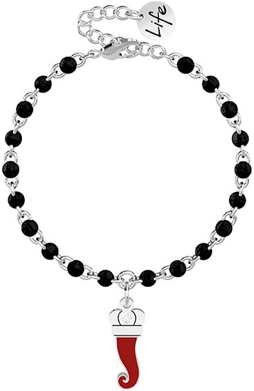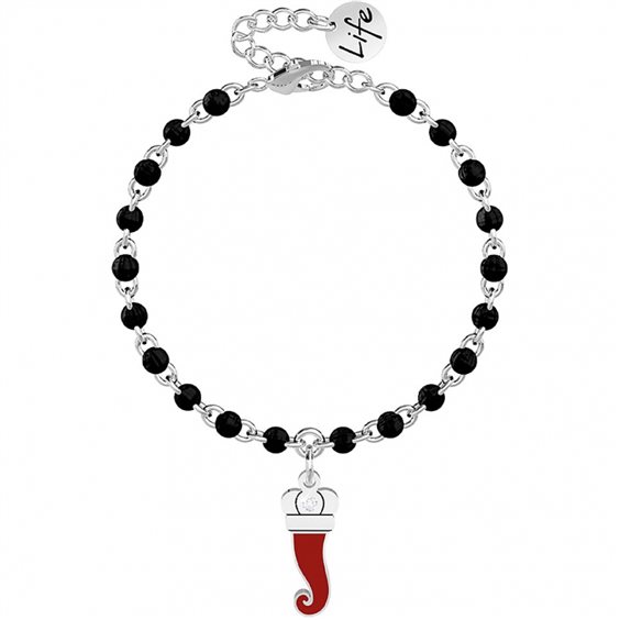 Bracciale in acciaio della serie Symbols con pendente in acciaio e smalto rosso raffigurante un cornetto, simbolo di protezione