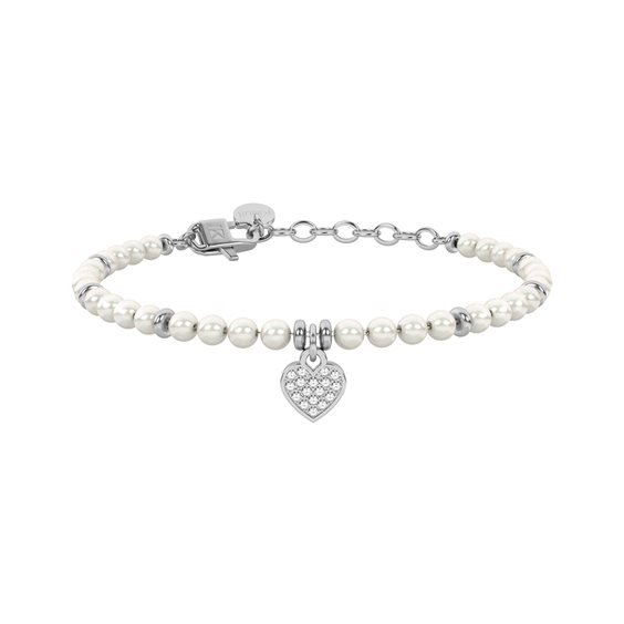 Bracciale in acciaio 316L, lunghezza regolabile da 16 a 19 cm, con perle conchiglia, ciondolo cuore e cristalli. Dimensioni: perle conchiglia Ø 4 mm, cuore 8.5x10 mm, cristalli Ø 1.25 mm