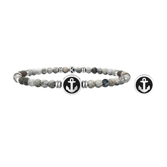 Bracciale elastico in acciaio 316L, circonferenza 19 cm, con agata striata marrone, elemento con PVD nero e ancora. Dimensioni: pietre Ø 4 mm, elemento Ø 10 mm