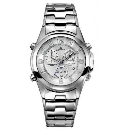 Questo modello dispone di un cinturino in acciaio inossidabile con chiusura deployante, cassa con pulsanti, corona e fondello in acciaio inossidabile, vetro in cristallo minerale zaffiro. Il quadrante silver dotato di ghiera fissa in acciaio inossidabile è provvisto di tre lancette, quella dei secondi con la parte terminale blu e quelle delle ore e dei minuti rivestite da materiale luminescente, numeri arabi e indici smaltati bianchi, un contatore dei piccoli secondi a ore 6, uno del cronografo a ore 2, un contatore con funzione sveglia a ore 10, un datario a ore 4.