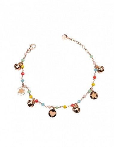 Bracciale incatenato pietre miste pastello, 3 medagliette e 4 campanelllini Soggetti medagliette: cuore, stella, quadrifoglio