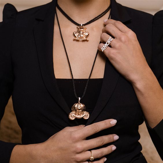 La Carrozza. Your Daily Fairy Tale. Collana corda torchon lunga 80 cm , contromaglia in zirconi e ciondolo Carrozza BIG. I grandi classici Rue des Mille tornano in questa collezione reinterpretati in dimensioni più grandi e eccentriche. Protagonista della collezione GO BIG è la tecnica dell'elettroformatura che rende i gioielli leggeri e resistenti al tempo stesso. Soggetto: Carrozza Lunghezza: 80 cm Grandezza ciondolo: 3,5/ 4 cm Finitura disponibile: Placcatura oro rosa 18kt Materiale: Argento 925 e tessuto Taglia: Unica Nichel free