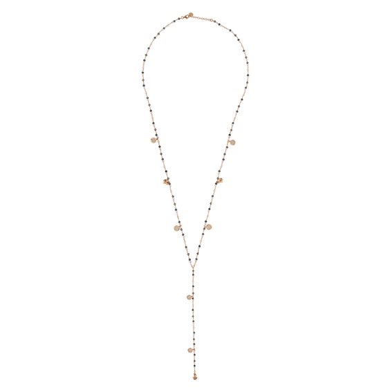Collana pendente della collezione Rue Des Mille Gipsy Chic da donna. Colore: oro rosa e multicolor. Il gioiello è in argento 925‰ con placcatura oro rosa 18kt composto da catena con pietre miste color pastello e medagliette con cuore, quadrifoglio e stella. Misura regolabile con chiusura a moschettone. con tre sonagli