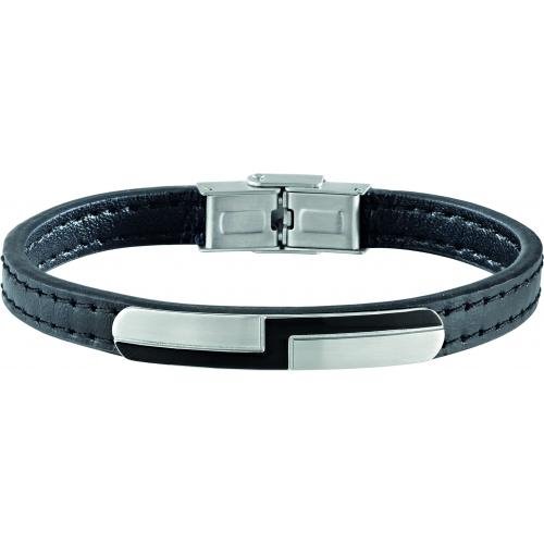 Bracciale da uomo in pelle nera con piastra in acciaio bianco e pvd nero; lunghezza 21 cm facilmente personalizzabile su richiesta