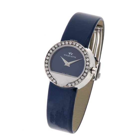 Movimento al quarzo ETA 901.001. Cassa in oro bianco 18 kt. ø 27 mm con brillanti incastonati (32 brillanti colore H, purezza WS, ¸ 1,4 mm per una caratura totale di +/- 0.22 kt.) Vetro zaffiro. Fondello serrato da 8 viti. Impermeabile 50 mt. Cinturino in pelle verniciata. Chiusura deployante personalizzata Wyler Vetta, con pulsanti di sicurezza. Foto reali