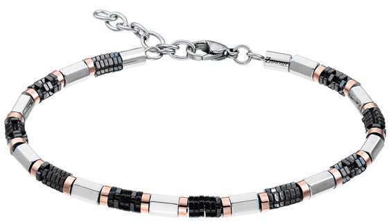 Bracciale in acciaio con elementi cilindrici e dischetti alternati con finitura acciaio, pvd nero e oro rosa.