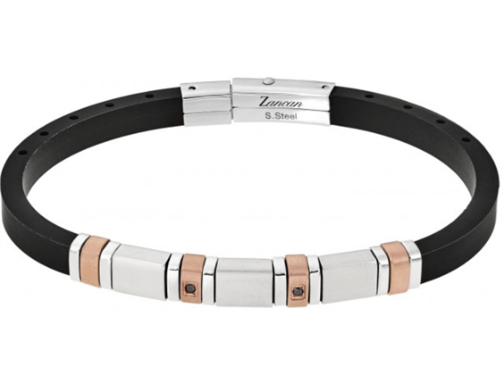 Bracciale da uomo di Zancan in acciaio e caucciù con inserto centrale in acciaio a finitura satinata e lucida, dettagli in pvd rosato. chiusura regolabile in acciaio.