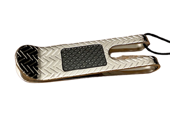 Fermasoldi marca "Zancan" in acciaio inciso con placca centrale in fibra di carbonio. Possibilità di personalizzazione con una incisione a piacere nella parte liscia sotto.